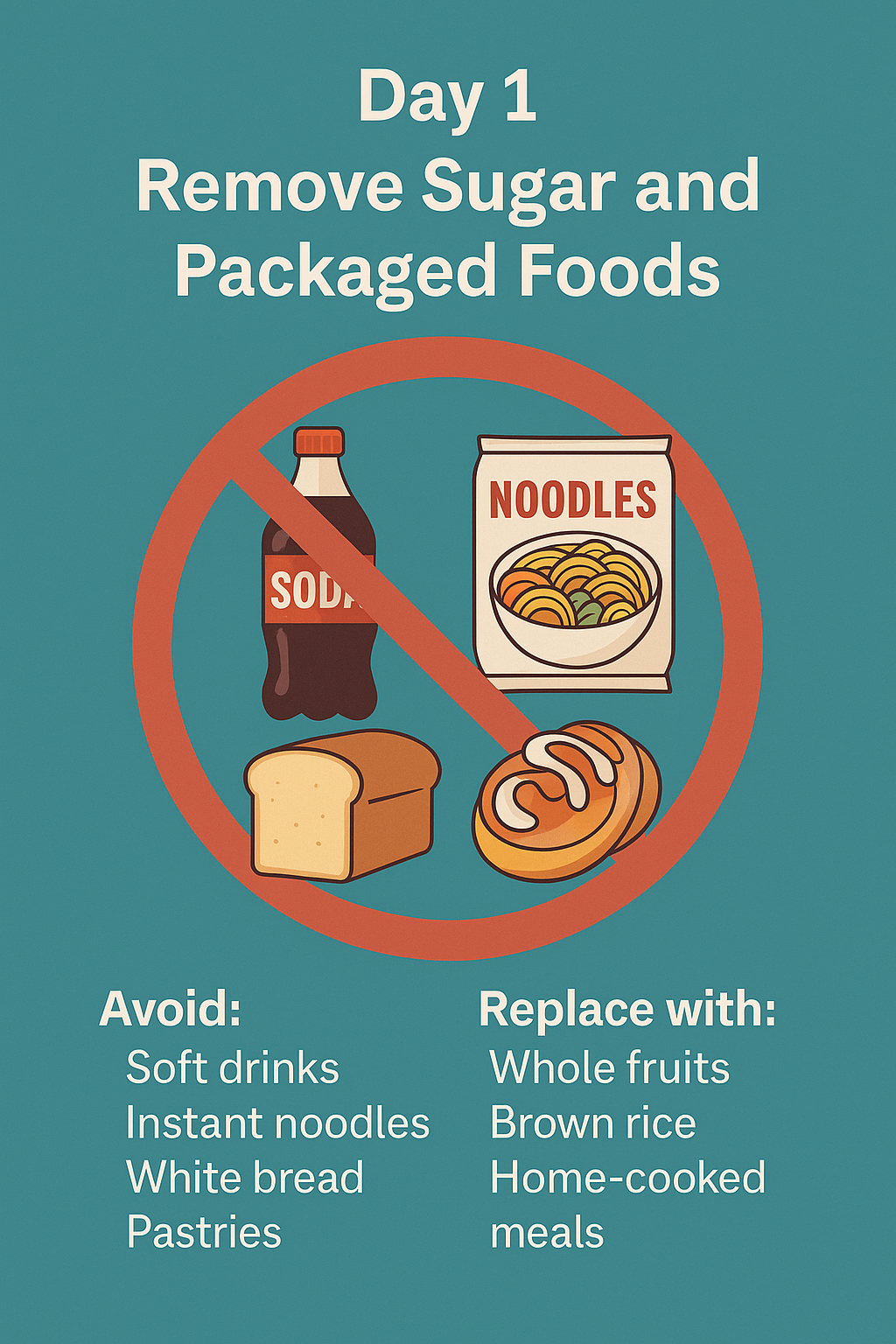 Replace with: whole fruits, brown rice, and home-cooked meals.